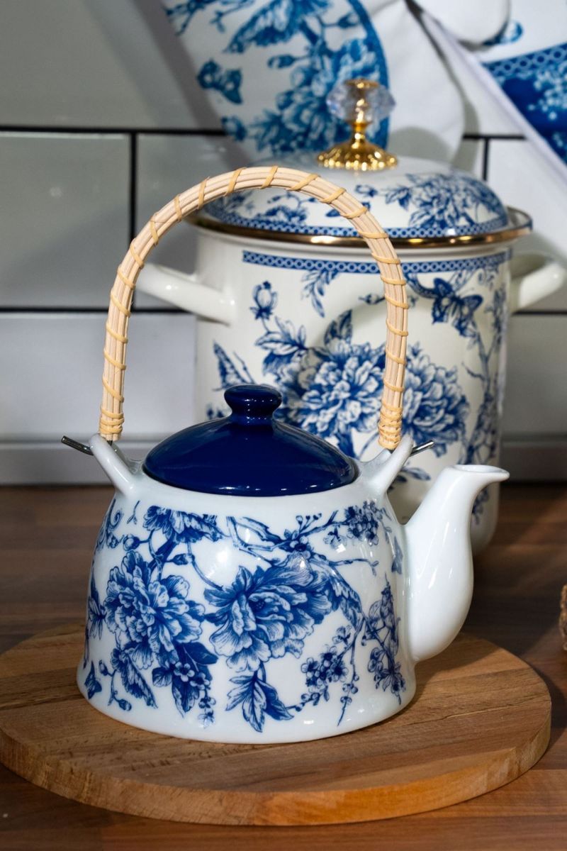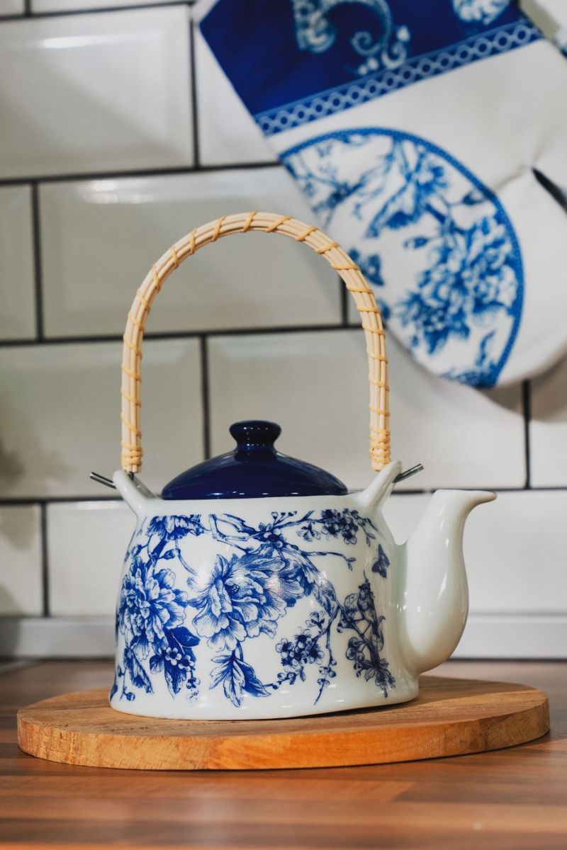 Blue Life Porcelain Herb Teapot with Wicker Handle