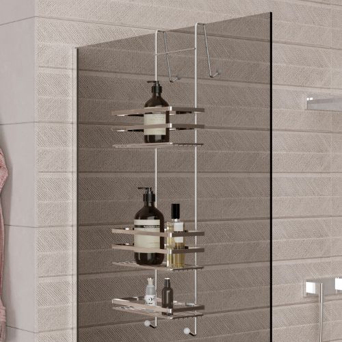 Three Tiers Shelf, Fastens on Over the Shower Unit Without Nails and Screws, Color Chrome, Size 25x21x78 cm